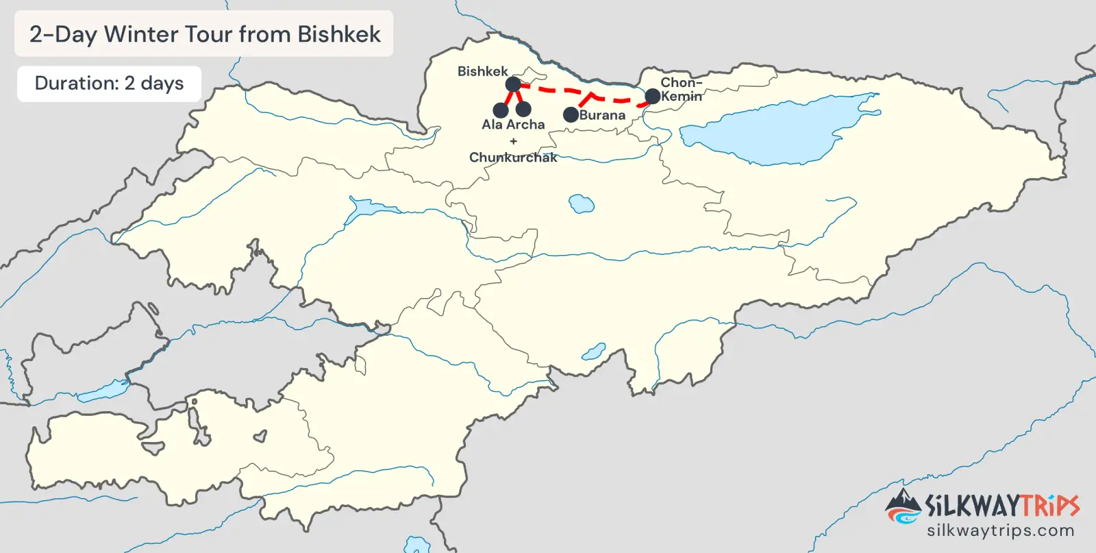 Утром мы заберём вас из вашего отеля в Бишкеке. Сегодня вас ждёт поездка в живописное ущелье Чункурчак — популярное зимнее место, окружённое заснеженными холмами и сосновыми лесами. Здесь вы можете насладиться различными активностями: