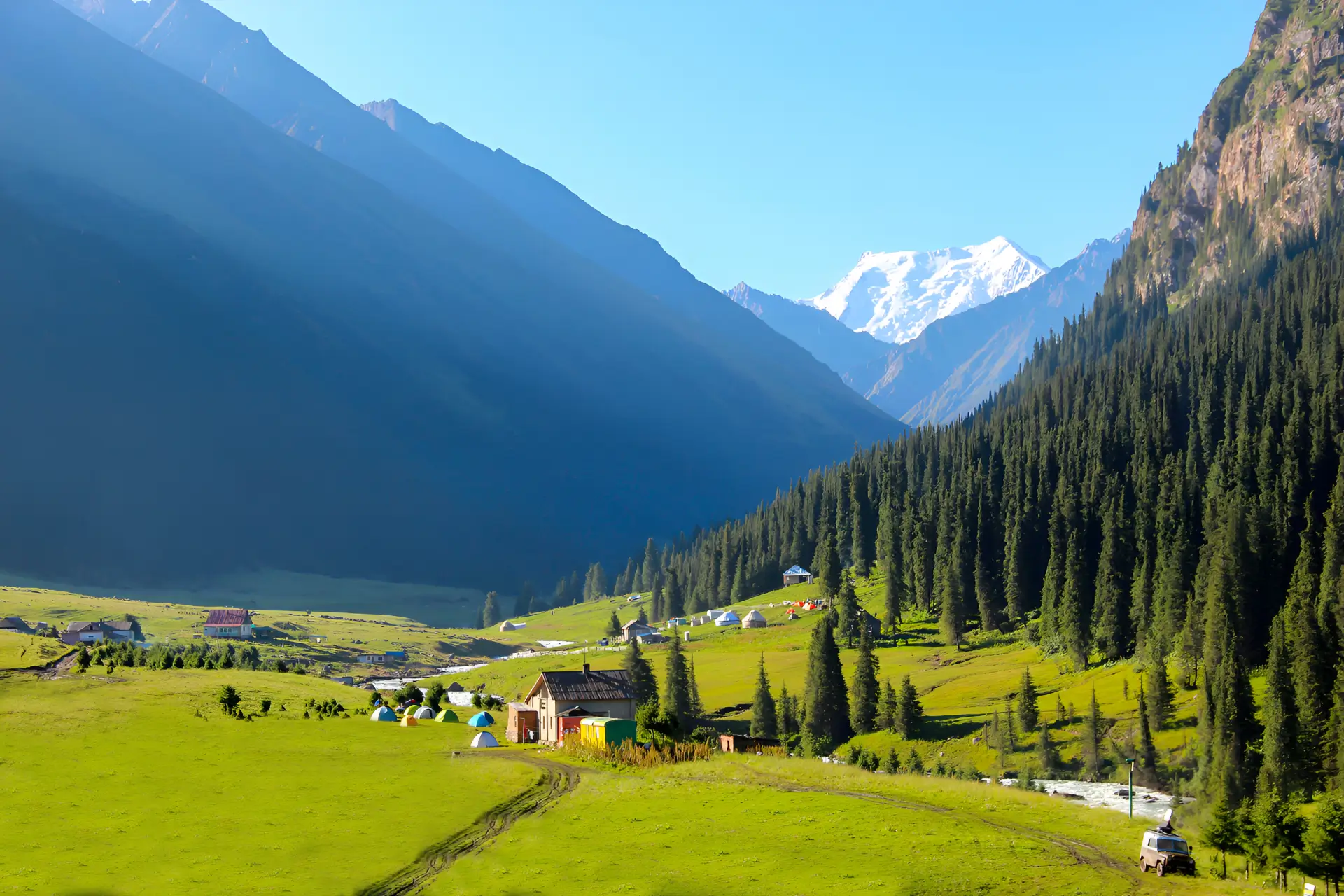 Долина окружена величественными горами, бурной рекой и густыми лесами — идеальное место для отдыха. Ближе к вечеру нас заберёт внедорожник прямо из ущелья Алтын-Арашан и доставит обратно в Каракол. Ужин в местных кафе и ночёвка в отеле.
