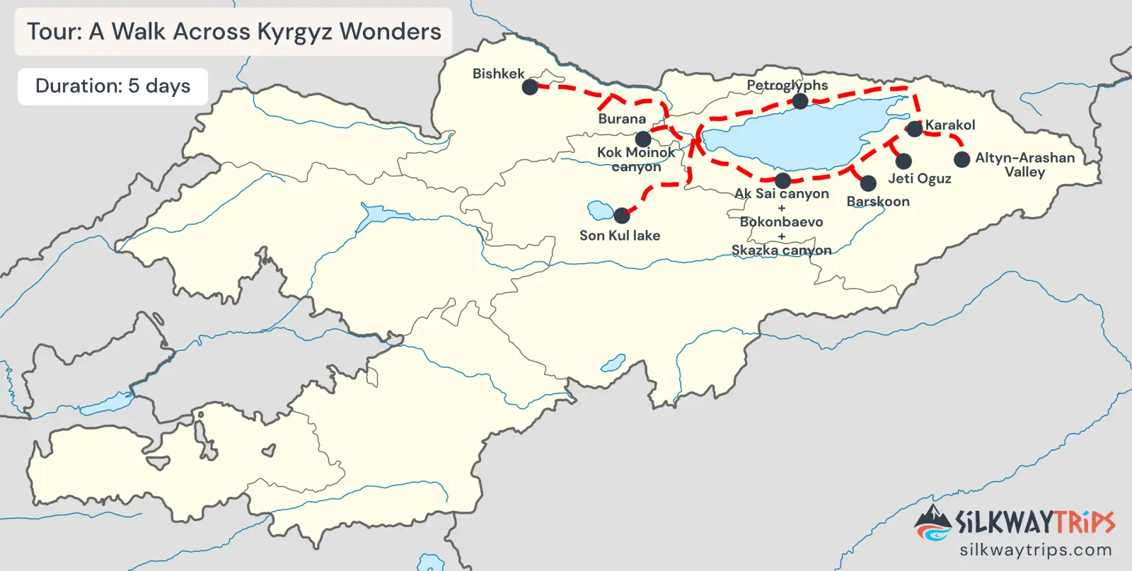 Вас ждут живописные пешие прогулки, внедорожные приключения и культурные впечатления, после которых вы вернётесь в Бишкек с незабываемыми воспоминаниями об этой удивительной и прекрасной стране.