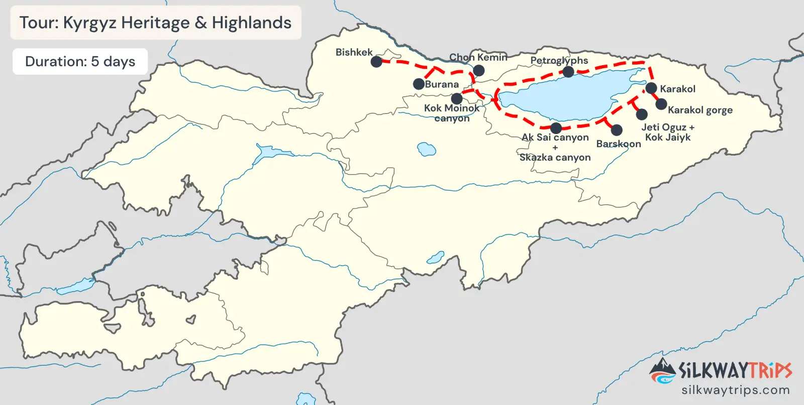 Откройте для себя Кыргызстан за 5 дней, исследуя исторические места, такие как Башня Бурана и древние петроглифы. Насладитесь верховой ездой в долине Чон-Кемин, прогуляйтесь по каньонам Сказка и Ак-Сай, посетите Барксунский водопад и скалы Джеты-Огуз. Познакомьтесь с местным беркутчи и посмотрите впечатляющее шоу охоты с орлом. Окунитесь в местную культуру на дунганском кулинарном шоу, а также остановитесь в традиционных юртах.